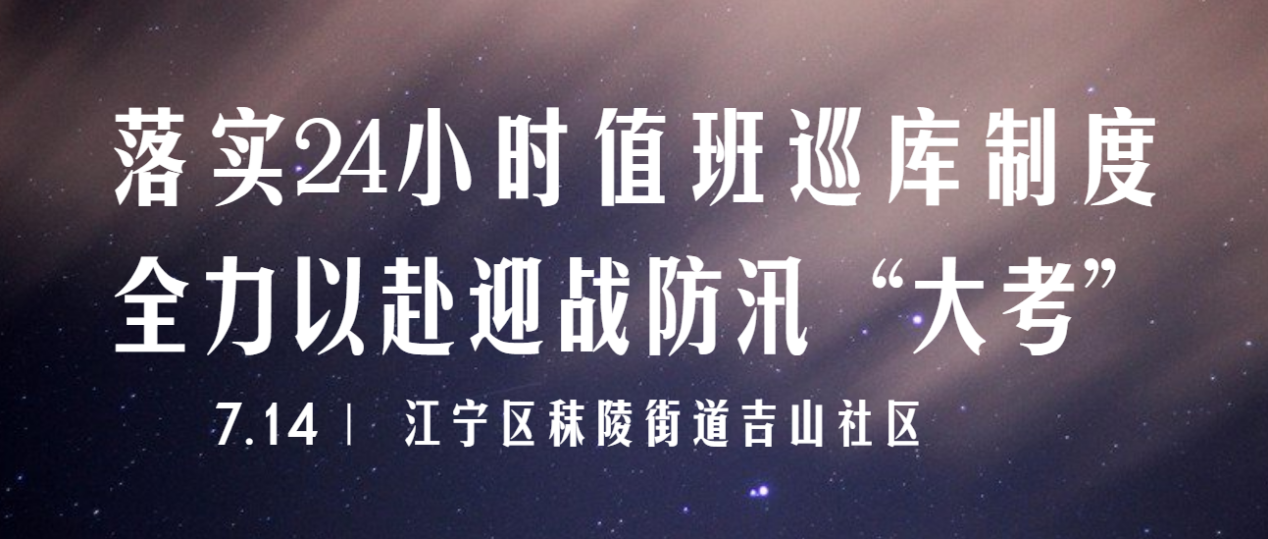 為扎實(shí)落實(shí)好防汛搶險(xiǎn)工作,保障轄區(qū)內(nèi)群眾生命和財(cái)產(chǎn)安全,7月14日,江寧區(qū)秣陵街道吉山社區(qū)嚴(yán)格落實(shí)24小時(shí)值班巡庫(kù)制度。