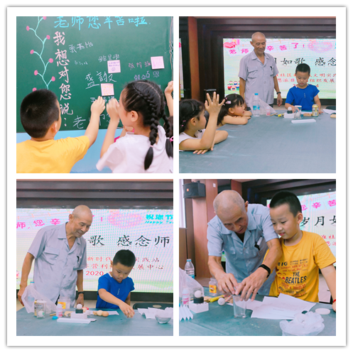 程老師是一位退休的物理教師,這次他為孩子們帶來了很多與生活有關的物理小實驗,耐心地進行演示和講解,每到精彩瞬間都贏得孩子們陣陣鼓掌的聲音。大家也興致勃勃地親手實驗起來,在程老師的指導和他們的共同努力下,一幕幕神奇的景象呈現(xiàn)在眼前,現(xiàn)場一片歡聲笑語?;顒拥母叱?,孩子們和程老師分享蛋糕,祝全天下的老師教師節(jié)快日。