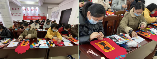 隨后,便開(kāi)始了中國(guó)風(fēng)新春掛飾的制作,社工首先展示了制作精美的成品,并向大家講解制作的步驟和技巧,看著面前的材料包,年輕媽媽們躍躍欲試,開(kāi)始認(rèn)真地制作作品,碰到困難的地方,積極地向社工請(qǐng)教。不一會(huì)兒,一個(gè)個(gè)“虎頭虎腦”、帶著“開(kāi)運(yùn)”祝福的掛飾就制作完成了,媽媽們把它們舉到胸前,許下新年的美好愿望,一起拍照留念,畫面定格在這一美好瞬間。