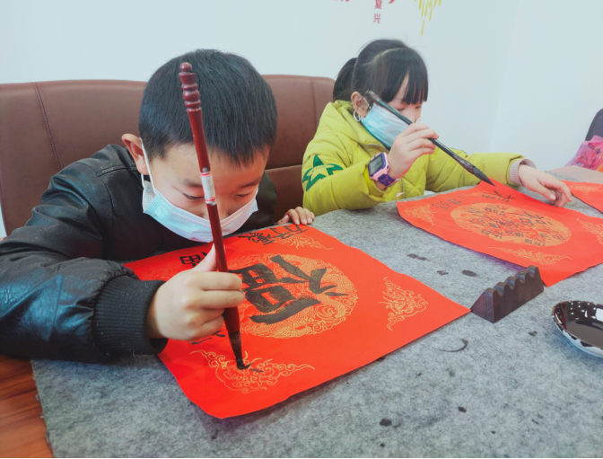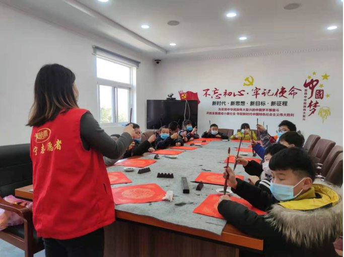 除了寫福字外,志愿者還組織孩子們?cè)跁炆蠈懴滦履曜8UZ(yǔ)送給自己。