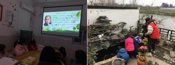 隨后,老師帶領(lǐng)小朋友們來到了“美麗庭院”獲獎?wù)叩募抑?,小朋友們對庭院中假山魚池產(chǎn)生了濃厚的興趣。老師借機(jī)向小朋友們講解人與自然的關(guān)系以及生態(tài)平衡對人類的重要性。正是“草色遙看近卻無”的時候,女孩子們看到庭院中的花花草草尤其喜愛。在觀賞花草時老師向她們講解種植盆栽的一些基礎(chǔ)知識,希望她們回去也種植一些,在欣賞美的同時學(xué)會創(chuàng)造美。在綠樹紅花間,孩子們徜徉在知識的海洋里閱讀書籍,書是人類進(jìn)步的階梯。喜歡書法的孩子情不自禁地?fù)]動毛筆練起來書法來,在這個美麗的庭院里人與自然呈現(xiàn)出一幅人與自然和諧的景象。
