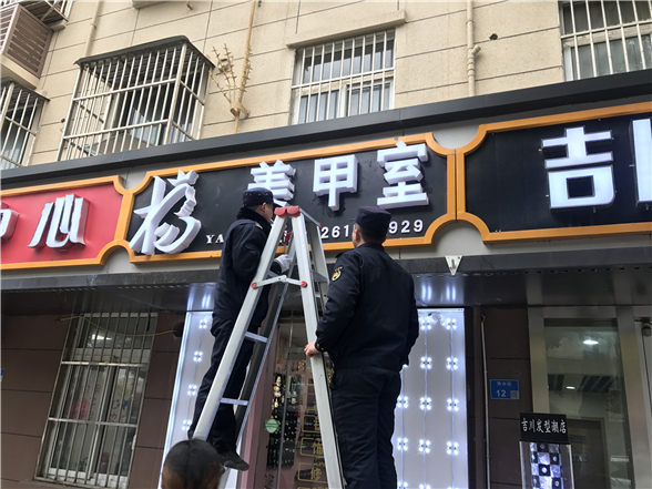 整治過程中,社區(qū)人員和執(zhí)法隊員一起對存在違規(guī)門頭的商戶進行宣傳,加強溝通,爭取當(dāng)事人理解,督促其自行拆除更換符合規(guī)定的門頭牌匾,同時主動向商戶講解門頭辦理流程及相關(guān)手續(xù),避免多走冤枉路。對于違規(guī)且不配合的商戶,城管執(zhí)法隊員堅決依法對其進行拆除,力護社區(qū)文明形象。