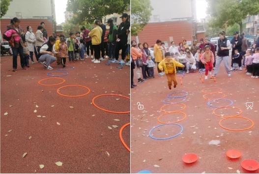第一項兔子過河,志愿老師一聲令下,靈活的“小兔子”們出動啦!他們要勇敢的跳過大河,摔倒了也不怕,爬起來接著跳,跳過危險的大河,摘取最好吃的蘑菇。第二項,分成兩隊,做接力賽,需要跳過障礙物,兩隊小朋友你追我趕,誓要超過對方,當然最后必須是友誼第一,比賽第二啦!最后一項是找帽子,要迅速跑到圈內(nèi),拿起帽子,給同樣顏色的小樁子迅速帶上,小朋友們一輪一輪排隊玩,玩得不亦樂乎。