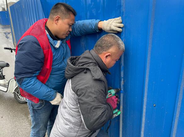 社區(qū)接到電話后第一時間組織社區(qū)工作人員帶上工具前往現(xiàn)場,發(fā)現(xiàn)部分圍擋出現(xiàn)被風(fēng)吹倒、傾斜、人為破損等現(xiàn)象,給出行的車輛和行人造成安全隱患。針對圍擋存在的問題,工作人員多措并舉,根據(jù)圍擋的類型、材質(zhì)、大小以及破損的程度等情況采取相應(yīng)的處理方法。一是利用鐵絲、扳手、老虎鉗等工具對輕微處進行修補,共修復(fù)5處。二是對嚴重破損的直接清除,并對圍擋加固,及時消除安全隱患,保障廣大居民的出行安全。