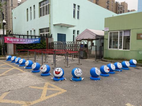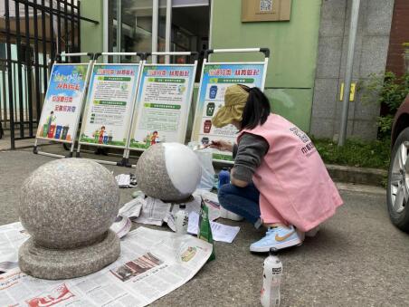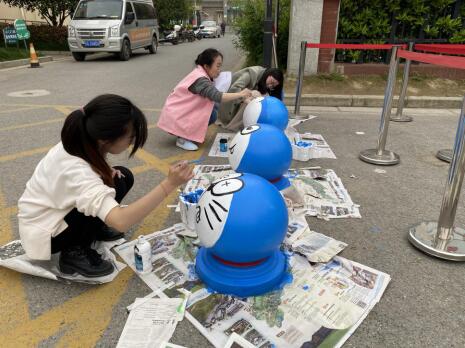 轄區(qū)內(nèi)的九鄉(xiāng)雅苑幼兒園門口共有15個石球,其功能是阻止車輛穿行,但是水磨石冷冰冰光禿禿的表面有煞風(fēng)景?;顒忧捌?,社區(qū)婦聯(lián)、社會組織、幼兒園進(jìn)行了前期溝通,結(jié)合幼兒園自身的特色,多次溝通后選定了多啦A夢的彩繪方案。