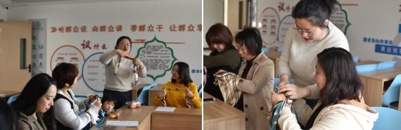 “將右側(cè)的絲帶放在左側(cè)絲帶上方,并從領(lǐng)口處掏出。”在社工的指導(dǎo)下,居民們開始練習(xí)平扣結(jié)的系法。對未成功的居民,社工進行了一對一指導(dǎo)。幾次練習(xí)之后,居民們都成功打出平扣結(jié)。相較于平扣結(jié),玫瑰結(jié)難度大一點,社工針對每位居民的打結(jié)情況,逐一指導(dǎo),居民們認真練習(xí)玫瑰結(jié)的系法。美麗的玫瑰結(jié)受到居民們的喜歡,和媽媽一同參加活動的小朋友們化身小模特,領(lǐng)口扎著漂亮的玫瑰結(jié),展示著媽媽的絲巾手藝。之后社工向居民們展示愛馬仕結(jié)的系法,此結(jié)法難度最大,居民們彼此幫助身邊的人,幾次練習(xí)后,居民們掌握了愛馬仕結(jié)的系法。