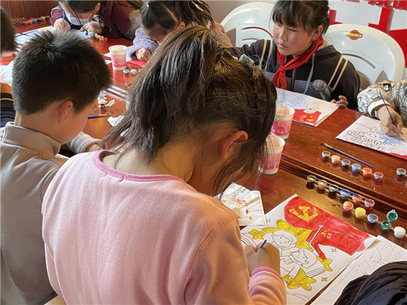 當(dāng)志愿者拿出愛黨愛國的手繪畫,同學(xué)們都懷著激動的心情,認(rèn)認(rèn)真真的為其填上美麗的色彩。在國旗黨旗之下,有紅色的天安門,有中國的萬里長城……一筆一畫都表達(dá)著同學(xué)們對祖國的熱愛,對黨的敬仰。