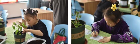 活動伊始,陳老師現(xiàn)場提問“人有五感有哪些”,強調親手種植的重要性。隨后,陳老師由勞動節(jié),引入到農作種植勞動,并介紹本次種植需要的各種材料,并詳細講解農作養(yǎng)植的注意事項。陳老師帶著小朋友和家長一同做熱身十字手指操,并分發(fā)材料給各位小朋友。種植開始后,小朋友們興趣高漲,與家人分工合作,放土、施肥、種苗、埋土,忙的不亦樂乎。“老師,我的土放好了,請給我肥料”、“媽媽,你看著,我去老師那領苗”,每位小朋友都全身心投入到農作種植中,兩盆植株很快就栽種完成。