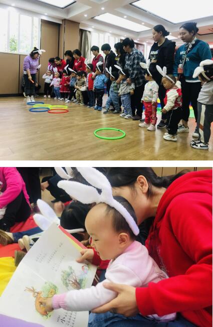 活動開始,老師帶領孩子們跳《親子寶貝操》,訓練寶寶走、跑、跳等基本動作,培養(yǎng)寶寶的節(jié)奏感和集體意識,消除緊張的情緒。通過游戲和音樂的熱身引導,小朋友們的注意力很快被吸引,認識了兔子,了解了它的生活習性等。在讀繪本這個環(huán)節(jié),老師帶領家長和小朋友們一起共讀繪本,并運用豐富的肢體語言,以增加故事的趣味性,孩子們聚精會神。隨后,在老師的引導下,寶寶們自己動手制作小兔子,增強寶寶的動手和協(xié)作能力。