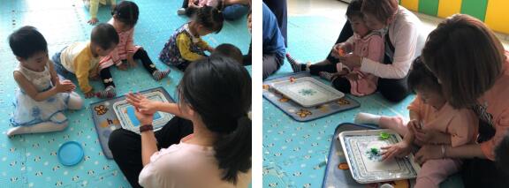 本次活動共吸引了社區(qū)11組家庭前來參與。活動現(xiàn)場,笑笑老師帶領(lǐng)寶寶們復(fù)習(xí)上一節(jié)課的模仿“小動物走路”游戲,“小烏龜是怎么走路的呀?”笑笑老師問。小朋友們一同回答道:“小烏龜走路爬呀爬”,小朋友們相比之前對環(huán)境更熟悉了,也更開朗。有的小朋友還學(xué)小烏龜走路,在地上爬、翻滾,家長們也在旁拿出手機記錄自家寶寶成長的一幕。到了自我介紹環(huán)節(jié),有位小朋友還沉浸在上一環(huán)節(jié),迷迷糊糊介紹道:”我是小烏龜……”引得現(xiàn)場的老師家長們?nèi)炭〔唤?。隨后,笑笑老師教小朋友們做泥塑,小朋友們在家長的協(xié)助下將橡皮泥搓圓捏扁。經(jīng)過各色橡皮泥的搭配和組合,一個個精美的泥塑成型了,有葡萄、草莓、香蕉等等。