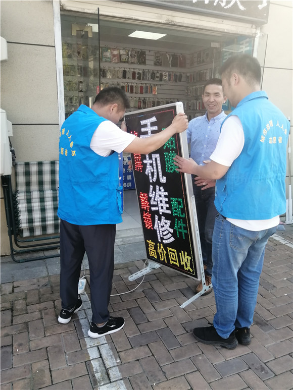 在日常網(wǎng)格巡查中,吳邊社區(qū)城市治理志愿者發(fā)現(xiàn)轄區(qū)部分商戶為了招攬生意,在店外擺放廣告燈箱。在本次整治行動中,吳邊社區(qū)聯(lián)合綜合執(zhí)法大隊工作人員,采取教育勸導、鼓勵自拆和嚴格查處相結(jié)合的方式,對轄區(qū)范圍內(nèi)違規(guī)設置的廣告燈箱、占道擺放的廣告牌進行“拉網(wǎng)式”排查,對于違規(guī)安裝的燈箱廣告,社區(qū)和綜合執(zhí)法人員與經(jīng)營戶協(xié)商立即拆除;對于有破損的廣告店招,重點檢查是否安裝穩(wěn)固,是否存在安全隱患,需要更換的現(xiàn)場要求經(jīng)營戶及時更換,消除安全隱患;對于亂張貼、亂懸掛的廣告橫幅,一律予以拆除;對于違規(guī)占道擺放的宣傳廣告牌,一律要求商戶收回店內(nèi),努力創(chuàng)造更加整潔有序的城市環(huán)境。