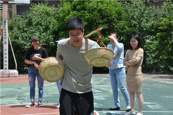 剪紙活動(dòng)后大家一起到戶外開展挑扁擔(dān)小游戲,體驗(yàn)戰(zhàn)爭(zhēng)歲月、擁軍支前的艱苦歷程。雖然游戲僅僅走了短短的30米,也沒有挑上百斤的糧食,但仍能讓大家體會(huì)到當(dāng)年紅軍戰(zhàn)士生活的艱辛以及他們堅(jiān)定的信念和意志。