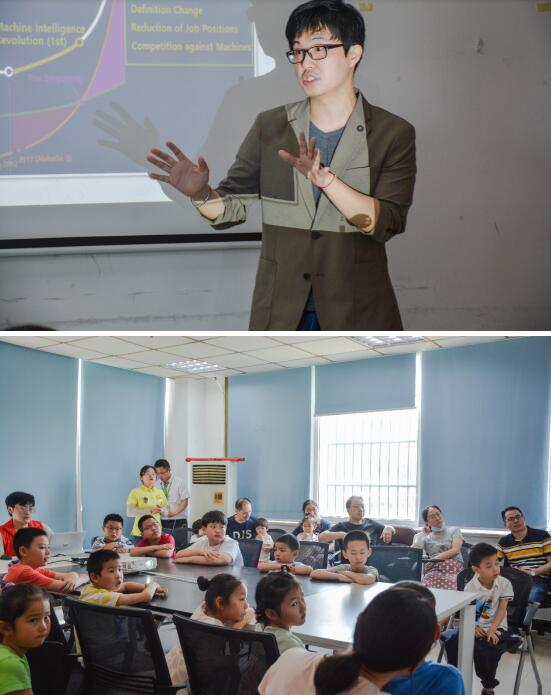 上午9點,社區(qū)的家長帶著自己的孩子們陸續(xù)來到這里,隨著整個會場座無虛席,本次活動正式開始。來自南京航空航天大學(xué)藝術(shù)學(xué)院的千炫珍教授為大家?guī)淼?ldquo;新時代思維教育的重要性”的科普講座。在講座中,千教授從第四次工業(yè)革命的角度談起,表達了設(shè)計思維的重要性,并通過在工業(yè)、商業(yè)、紡織業(yè)、農(nóng)業(yè)等不同行業(yè)的不同例子的展示,生動的展現(xiàn)了在技術(shù)發(fā)達的當(dāng)下,轉(zhuǎn)變并擁有設(shè)計思維的重要意義。同時,千教授還通過圖像演示等方式,向大家展示了3D打印、機器人等新技術(shù)的工作原理,激起了孩子們的興趣,也吸引了現(xiàn)場家長的注意力。