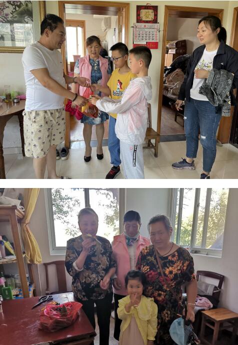 隨后,志愿者們各自分組領(lǐng)著親子家庭帶著香粽香囊進(jìn)行上門慰問。“程奶奶,端午節(jié)快到了,祝您端午節(jié)快樂啊!小區(qū)現(xiàn)在開展三全家庭教育支持行動,孩子們跟隨我們一起來給您送粽子和香囊。”獨(dú)居老人程桂英老奶奶看到端木銘熙小朋友的到來,驚訝、興奮地雙手捂著嘴不住地表示感謝;癱瘓?jiān)诖驳慕棠炭吹街驹刚呒昂⒆觽兊奈繂?,流下了高興地淚水;因眼部殘疾看不見的湯寶玉伯伯用手觸摸孩子們送的粽子香囊,激動地說不出話來;獨(dú)居退伍老兵楊志才老人拄著拐杖目送志愿者及孩子們,眼神中流露出激動目光......