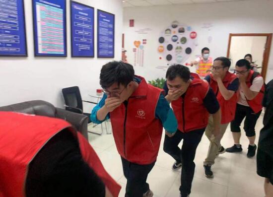 在掌握了基本的理論和實(shí)際操作技能后,隨著現(xiàn)場(chǎng)濃煙冒起,演練正式開(kāi)始,大家聽(tīng)到引導(dǎo)員的指示后,紛紛拿著濕毛巾捂著口鼻,貓著腰,扶著墻,有序快速地從樓道內(nèi)撤退到空曠的路面,順利完成消防逃生演練。