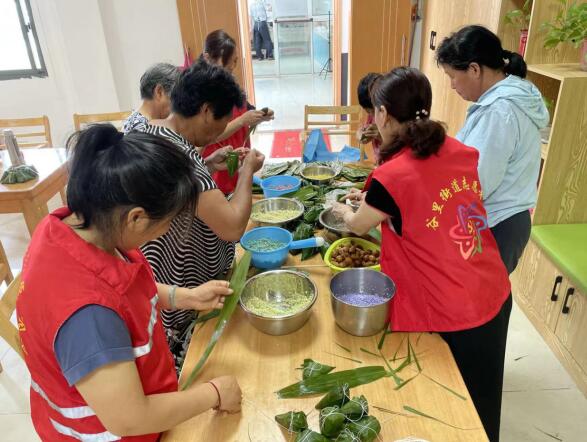 既然是端午節(jié),那粽子自然是必不可少!隨后便進(jìn)入到包粽子環(huán)節(jié)。今年的粽子可不是那么簡(jiǎn)單的,社工為大家準(zhǔn)備了提前用紫甘藍(lán)、菠菜、莧菜等多種蔬菜汁浸泡好的彩色糯米,制成獨(dú)具特色的彩色粽子?;顒?dòng)現(xiàn)場(chǎng),大家有說有笑地圍在一起,拿粽葉、舀糯米、放蜜棗、包裹、捆扎,其樂融融。參加活動(dòng)的的戴阿姨說:“端午節(jié)的時(shí)候包粽子、吃粽子,一直是我們中國的傳統(tǒng)習(xí)俗,今天的活動(dòng)不僅讓我們感受到了濃濃的傳統(tǒng)文化氛圍,而且也使大家在互幫互助的包粽子過程中增進(jìn)了感情,拉近了彼此間的距離,這樣的活動(dòng)既有意思又有意義。”