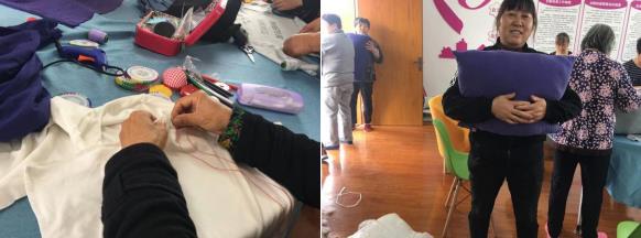 最后,大家各自分享講述自己的作品,講述著帶回家里準備怎么用,有的說腰不好可以放在椅子上靠著,有的打算坐沙發(fā)上看電視的時候抱著,有的拿回去給孩子用,有的要放在床頭靠著。大家都覺得非常的實用,家里的舊衣服有了“用武之地”。