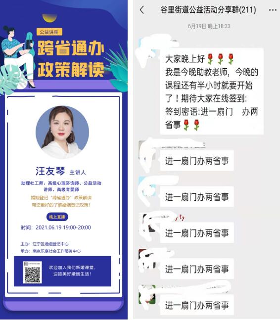 為了普及推廣婚姻登記新政策試點工作,于2021年6月19日晚上19:00南京江寧區(qū)婚姻登記中心聯(lián)合南京樂享社會工作服務(wù)中心舉辦婚姻登記“跨省通辦”政策解讀線上公益直播課。