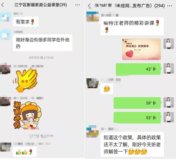 本次活動由江寧區(qū)婚姻輔導(dǎo)室汪友琴老師通過語音講解、互動咨詢、在線調(diào)查三個環(huán)節(jié)進(jìn)行在線開展,婚姻登記中心有效利用網(wǎng)絡(luò)力量和社會組織現(xiàn)有資源,通過技術(shù)手段鏈接江寧區(qū)十多個社區(qū)上千人群體進(jìn)行有效宣傳新政策。