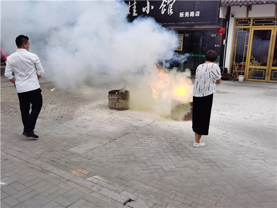 講座結(jié)束后,所有人來到了室外,特勤隊員向大家介紹了消防器材的使用方法和技能,然后進行了消防實戰(zhàn)演練,現(xiàn)場準備了兩個滅火桶及16具滅火器,商戶們在消防隊員的指導下,全部完成了滅火訓練。