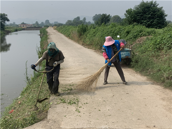 花園村集中組織10名城市志愿者,動(dòng)用割草機(jī)3臺(tái),對(duì)靖安河沿岸雜草進(jìn)行清除;利用釘耙、網(wǎng)兜等作業(yè)工具,打撈河內(nèi)的水生植被和漂浮物;并將清理的雜草雜物聚集岸邊,集中統(tǒng)一清運(yùn)。
