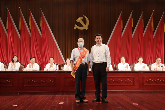 劉書記為老黨員代表頒發(fā)“光榮在黨50年”紀念章
