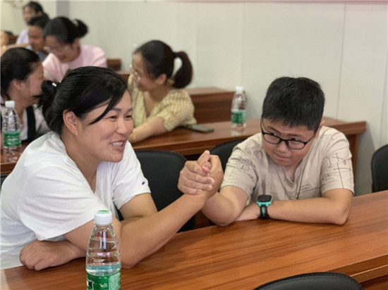 講座之余,社區(qū)親子還進行了權(quán)力之爭小游戲——掰手腕,家長和孩子們積極地參與進來,熱情地分享了游戲的感悟。