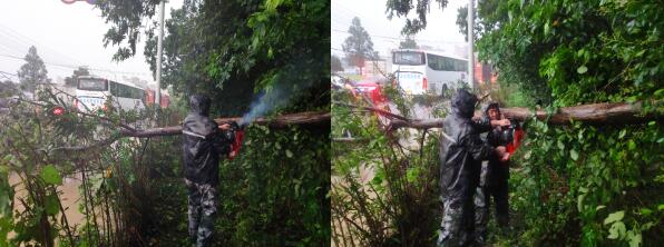 現(xiàn)場道路兩旁,有的樹木歪歪斜斜,搖搖欲墜,有的樹木直接橫臥在了路面上,導(dǎo)致車輛無法正常通行,志愿者們分工協(xié)作,使用電鋸將大樹鋸斷,然后搬離道路,歪斜的樹木也得到了清理,經(jīng)過大家共同努力下,橫臥在路面的大樹被徹底清空,道路交通恢復(fù)正常。