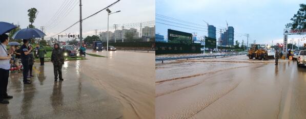 之后,社區(qū)工作人員又發(fā)現(xiàn)紅楓片區(qū)保障房錢道路大面積淹水,針對(duì)這一情況,社區(qū)工作人員到達(dá)現(xiàn)場,并立刻聯(lián)系市政管理處等相關(guān)部門,經(jīng)過多方協(xié)調(diào),安排3輛裝載機(jī)到達(dá)現(xiàn)場,對(duì)路面積水進(jìn)行全面清理。同時(shí)為加速清理積水,社區(qū)工作人員穿著雨衣,打開窨井蓋,經(jīng)過2個(gè)小時(shí)的奮戰(zhàn),成功將路面積水基本排空,道路交通恢復(fù)暢通。