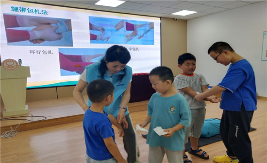 在急救知識培訓(xùn)環(huán)節(jié),劉老師給大家做了關(guān)于“如何撥打120”、“止血包扎”、氣道異物梗阻急救和心肺復(fù)蘇術(shù)相關(guān)知識的培訓(xùn)。在止血包扎培訓(xùn)環(huán)節(jié),劉老師請小朋友上前示范,分別扮演救助者和受傷者,悉心指導(dǎo)包扎細節(jié),糾正錯誤。