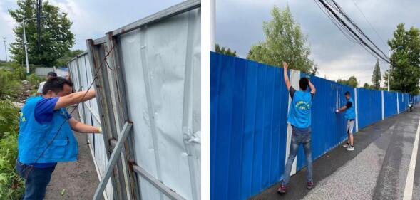 社區(qū)接到電話后,第一時(shí)間組織了城市治理志愿者帶上工具趕赴崗龍路,確定情況屬實(shí)后,志愿者們隨即用電鉆、鉗子、鐵絲等工具將倒伏和破損的圍擋進(jìn)行修繕、固定。因?yàn)樘鞖鈵毫樱箫L(fēng)給志愿者們的工作增添了阻力,但他們沒(méi)有怨言,認(rèn)真工作,互相配合,通過(guò)一個(gè)多小時(shí)的努力,圍擋得到修復(fù),方便了來(lái)往行人、車輛的通行,同時(shí)也為他們提供了有效的安全保障。