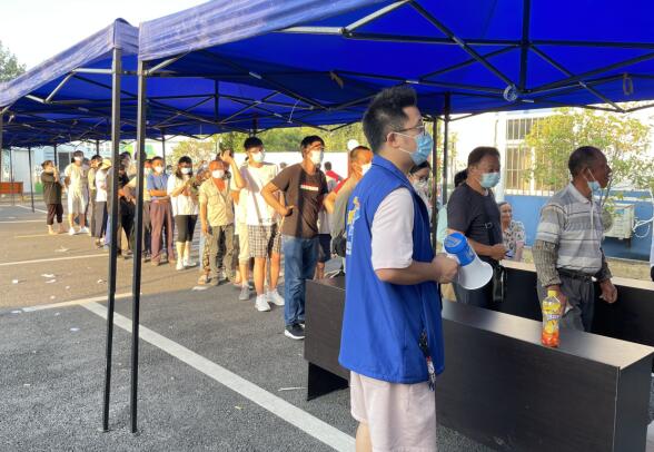 “從一大早就開始到現(xiàn)場布置,時刻要注意現(xiàn)場情況,引導(dǎo)居民們有序排隊入場。”該社區(qū)網(wǎng)格員說,自己已在烈日下工作了好幾個小時,身上的衣服都已被汗水浸濕。