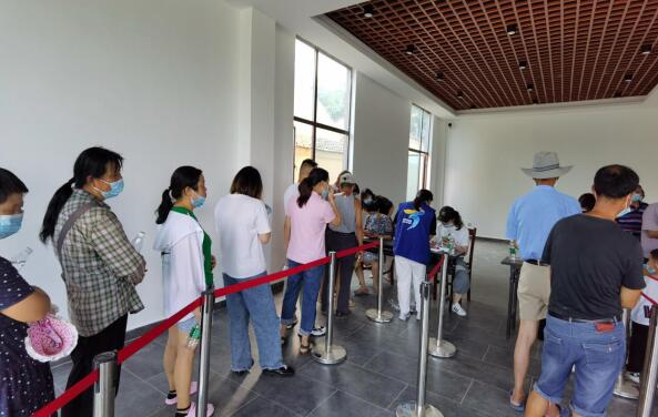 “大家都不要著急,今天我們不休息,排到100后的村民朋友可以先去吃午飯,下午再過來,今天哪怕是到凌晨我們也會(huì)一次性檢測(cè)完,大家不要著急。”鶴齡社區(qū)網(wǎng)格員拿著手持?jǐn)U音器,不斷向尚不了解情況的村民介紹流程和安排。烈日炎炎,有的工作人員在烈日下做好居民排隊(duì)檢測(cè)的秩序維穩(wěn)工作;有的網(wǎng)格員為排隊(duì)等候村民發(fā)放礦泉水、加裝空調(diào)電風(fēng)扇,為醫(yī)護(hù)人員和村民群眾做好防暑降溫工作;有的黨員干部在大廳里面負(fù)責(zé)登記人員信息,10個(gè)人一組,收集身份證,做好二維碼登記,再負(fù)責(zé)帶領(lǐng)這組人員到醫(yī)生處采集核酸,讓全員核酸采集工作有條不紊地進(jìn)行。