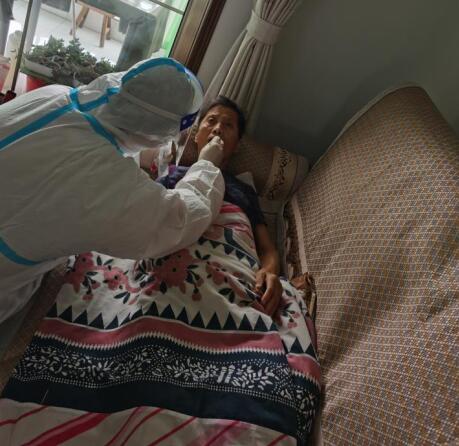 在核酸檢測(cè)的工作進(jìn)行中,一位老人引起了醫(yī)護(hù)人員和社區(qū)工作人員的特別注意。老人因重病住進(jìn)南京市鼓樓醫(yī)院,14號(hào)剛剛出院,目前仍處于臥床不能自理的狀態(tài),根本無法到檢測(cè)點(diǎn)現(xiàn)場(chǎng)做核酸檢測(cè)。針對(duì)這一情況,社區(qū)工作人員決定帶著醫(yī)護(hù)人員上門給老人做核酸檢測(cè),真正做到全覆蓋,不落一戶、不漏一人。