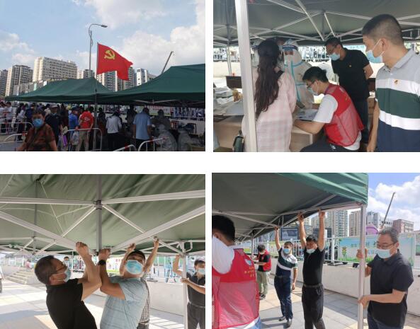 “把黨旗豎起來,讓黨員徽章亮起來,把紅袖章戴起來,志愿服務干起來!”檢測現(xiàn)場,由社區(qū)兩委帶隊,每個點位配備2隊,每隊10人,以4人為一組,在檢測點位為居民搭建帳篷、提供椅子。同時,在場地分設進出口,2位志愿者加班加點,力求加強現(xiàn)場秩序維護,保障檢測秩序。志愿者們分工合作,有的負責入場測溫,提示居民出示蘇康碼、佩戴口罩;有的負責維持現(xiàn)場秩序,引導居民有序排隊;有的負責采樣登記,協(xié)助居民填報信息,發(fā)放檢測排號……大家都在各自的崗位上盡心盡力,通過自己的努力,協(xié)助醫(yī)護人員順利、有序地完成每一位群眾的核酸檢測工作。