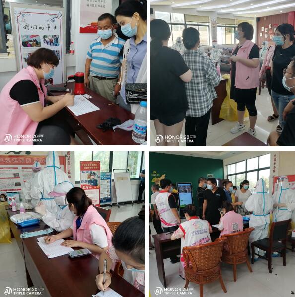檢測現(xiàn)場,江寧區(qū)江寧街道天然村婦聯(lián)、巾幗志愿者積極參與疫情防控工作,履職盡責,沖鋒在前,她們穿梭在人群當中,引導群眾進行有序排隊,幫助群眾登記信息,期間還積極解決群眾疑難問題,維持現(xiàn)場秩序。