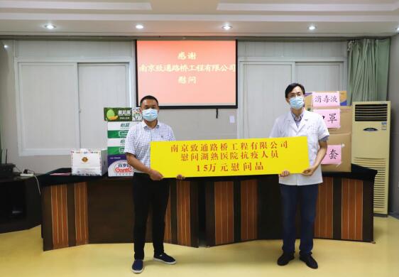 7月23日上午,在總經(jīng)理笪囯慶的帶領(lǐng)下,湖熟本土企業(yè)南京致通路橋工程有限公司走進(jìn)湖熟社區(qū)衛(wèi)生院,為一線醫(yī)護(hù)人員捐贈(zèng)口罩、消毒水、礦泉水、方便面、水果等防疫、防暑用品共計(jì)15萬(wàn)元物資,助力疫情防控。
