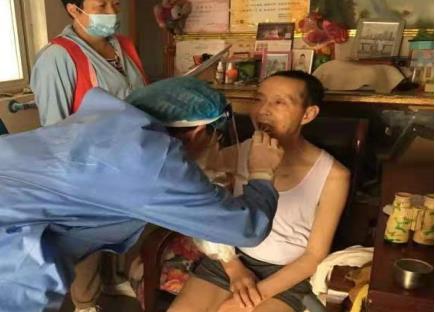 在陶吳社區(qū)有很多年齡大,臥病在床的老人,加上天氣炎熱,他們無法前往集中檢測點進行核酸檢測。針對這種情況,陶吳社區(qū)志愿者與負責核酸檢測采集工作的醫(yī)護人員組成專門的采樣工作小組,分頭前往行動不便的老人家中進行核酸檢測。先由志愿者將老人的信息進行登記,再由醫(yī)護人員對醫(yī)療物品進行消毒,之后進行咽喉取樣并囑咐老人們要做好個人防護。讓老人們不用出門就可以完成檢測,確保核酸檢測不漏一人。