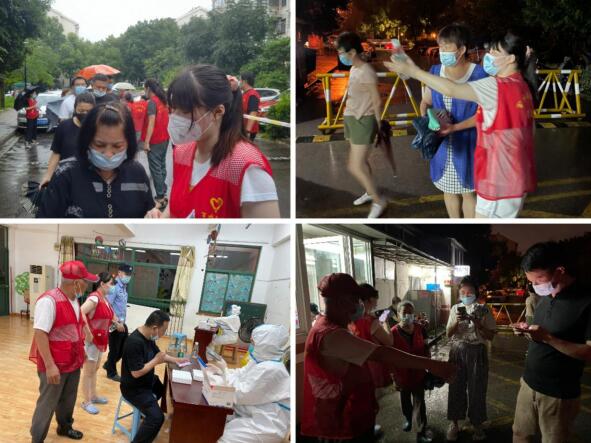 家住百水家園小區(qū)的老黨員周紹銀,今年78歲,黨齡51年,他是黨小組長、社區(qū)的平安志愿者、“博愛家園”志愿者。他一直熱心社區(qū)事務(wù),在他的感染下,他的愛人顧愛美也加入了社區(qū)志愿者隊伍,參與到社區(qū)的治安巡邏中。南京疫情爆發(fā)之后,周師傅第一個響應(yīng)社區(qū)號召,毅然加入社區(qū)疫情防控工作,在醫(yī)務(wù)工作者、社區(qū)工作人員徹夜為居民做核酸檢測時,年近80歲的他也跟著一起維護(hù)秩序到深夜。第二輪檢測開始后,因為任務(wù)緊,社區(qū)人手嚴(yán)重不足,周師傅還叫來了她的孫女顧瀅做志愿者。采集當(dāng)天,因為臺風(fēng)影響,南京下起了暴雨,祖孫二人冒著雨,爺爺在現(xiàn)場維持秩序,孫女則幫助不會使用微信的老年人注冊核酸檢測采集碼,忙得渾身濕透卻毫無怨言。到了夜里,周師傅的愛人也在執(zhí)勤之余跑來幫忙。祖孫三人,用責(zé)任與擔(dān)當(dāng)守護(hù)著我們的生命,堅守著我們的家園。三人穿著一樣的紅馬甲站在一起,形成了一道溫馨而亮麗的風(fēng)景線。