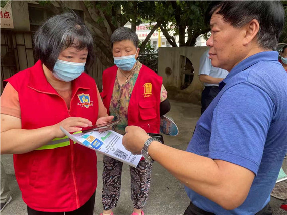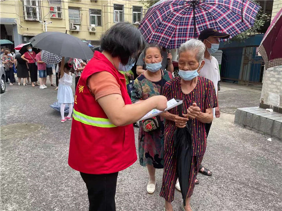 家住堯安新村小區(qū)的陳婷同志是一名退休的黨員干部。在沒有外墻的老舊車棚里,醫(yī)護(hù)人員在里面做核酸檢測,陳婷就和其他志愿者們在小區(qū)巡查,勸導(dǎo)居民響應(yīng)號召,來做核酸檢測。烈日炎炎,大家在小區(qū)巡走半圈就汗流浹背,每天工作10多個小時,志愿者馬甲都能擰出水。