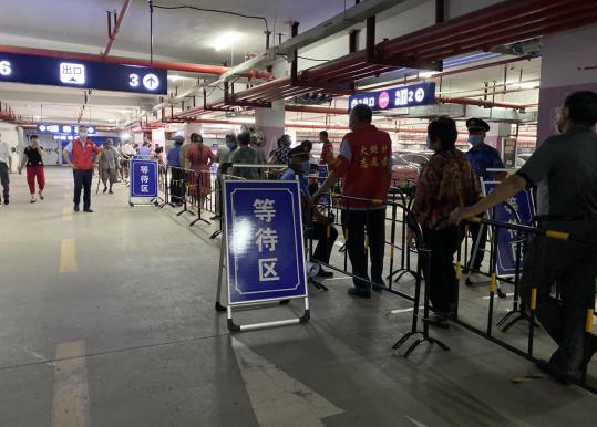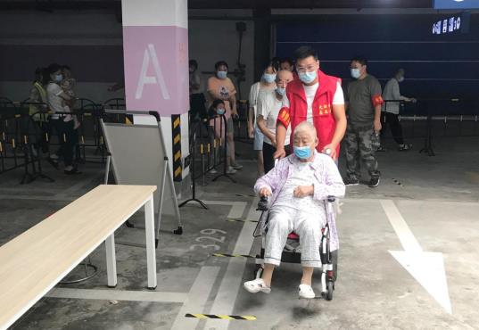 另一邊志愿者也在喊話,清點(diǎn)人數(shù),“十人一組,依次排隊(duì),不要走亂了”引導(dǎo)居民排隊(duì),為了照顧老弱病殘及婦孺,志愿者們還不時(shí)走到隊(duì)伍盡頭,看看是否有抱著孩子的婦女、腿腳不便的老人及殘疾人需要優(yōu)先安排,發(fā)現(xiàn)腿腳不便的老人和殘疾人,志愿者們第一時(shí)間來(lái)到他們身邊,攙扶著他們到采樣點(diǎn)。