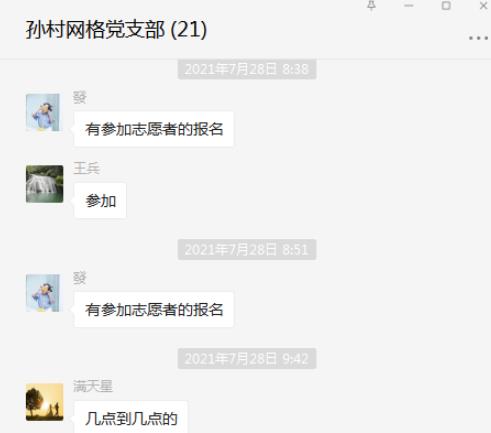 新冠肺炎疫情牽動著我們每一個人,離不開每一個人的付出。7月21日,第一次全員核酸檢測,王兵趕到現(xiàn)場引導人們正確戴好口罩、不扎堆、保持1米線,一直堅持到凌晨12點半;7月23日,王兵看到村部人手緊缺,積極配合布置第二次核酸檢測現(xiàn)場;7月28日孫村網(wǎng)格黨支部急需招募志愿者為第三次核酸采集點做志愿服務(wù),王兵第一時間響應(yīng)。期間,王兵積極引導轄區(qū)村民群眾提高防控意識,引導廣大村民群眾科學應(yīng)對,不信謠、不傳謠,全力以赴配合做好疫情防控工作,在村民群眾身邊構(gòu)筑起了防控疫情的一道堅固防線,并配合村“兩委”收集整理相關(guān)疫情信息,成為時刻守護在群眾身邊一抹鮮艷的“志愿紅”。