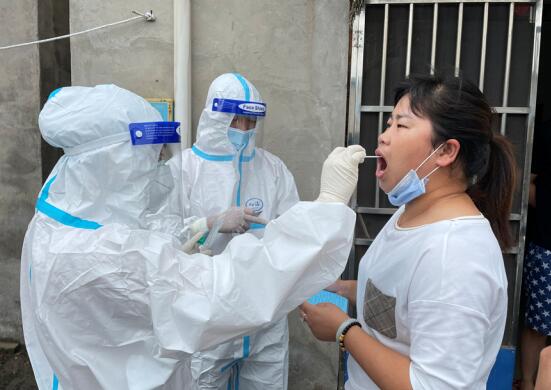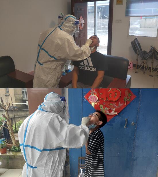 每次核酸檢測前,醫(yī)護人員都要嚴密做好防護工作,防護服、手套、防護面罩、口罩每一個環(huán)節(jié)一絲不茍,給了居家隔離人員慢慢的安全感。在進行核酸檢測時,醫(yī)護人員還會用言語安撫、鼓勵居家隔離人員,“沒事的啊,只要你之前做好了防護工作,被感染的概率還是很低的。”在居家隔離人員的眼中,每一次來給自己做核酸檢測的“大白”送來了沉甸甸的溫暖。“說不恐慌那是假的,但是只要你們在,我就會安心很多。”一位居家隔離人員對著醫(yī)護人員說著。