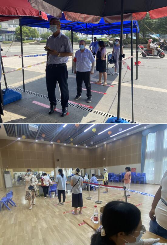 在志愿者與工作人員指引下,居民按照規(guī)劃好的排隊路線間隔一米有序排隊。因為天氣炎熱,社區(qū)在室外排隊路線上安置了遮陽棚,防止居民在排隊等候期間中暑。在社區(qū)兩委干部的積極帶動下,社區(qū)工作人員和志愿者始終在烈日下堅守在崗位上,為社區(qū)居民服務(wù),哪里有需要,哪里就有他們的身影。汗水打濕了他們的衣服,卻又在陽光下曬干。