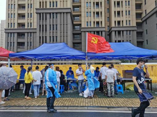 上坊新城檢測(cè)點(diǎn),來的最早走的最遲的黨員儲(chǔ)意平,現(xiàn)場(chǎng)的布置、物資的管理、現(xiàn)場(chǎng)秩序的維持、環(huán)境的消殺等等,到處都能看到他的身影,而他總是精力充沛,跑這邊跑那邊,也總是笑嘻嘻地說:“沒事,我不累。”
