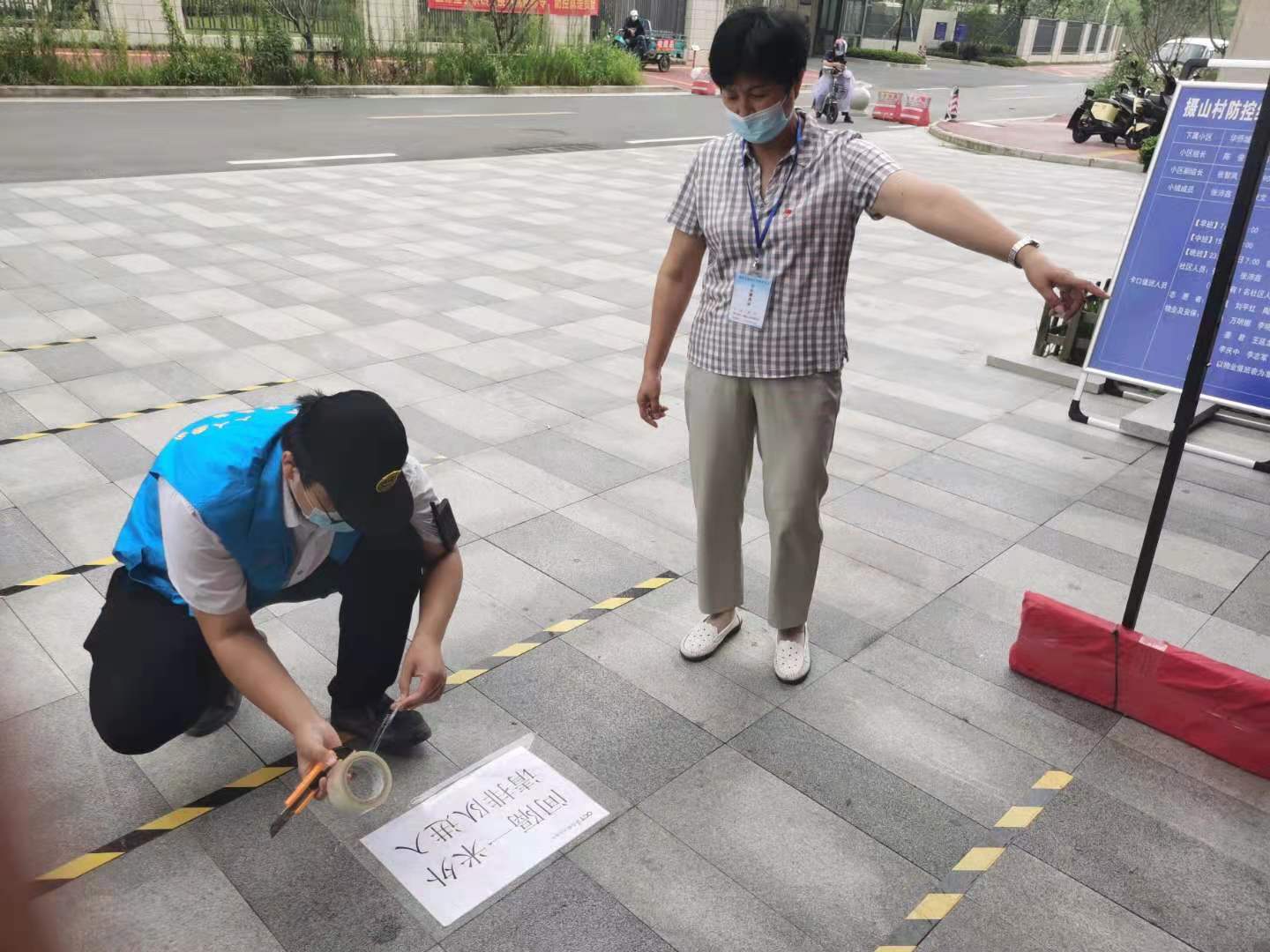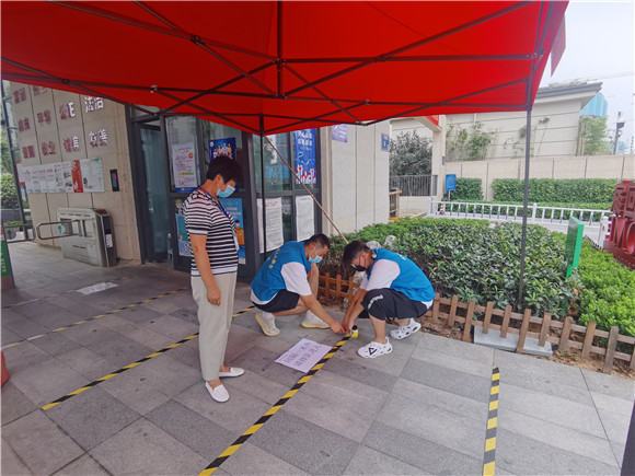 在檢查小區(qū)防疫措施落實(shí)情況時(shí),城市治理委員會公眾委員發(fā)現(xiàn)因小區(qū)大門口來回小推車和電動車進(jìn)出比較頻繁,導(dǎo)致部分隔離帶有破損缺失,故組織城市治理志愿者,對小區(qū)大門口的“一米線”隔離帶進(jìn)行了修補(bǔ)更換。志愿者俯身把破損的更換下來,嚴(yán)格按照規(guī)定的間隔距離加貼上新的“一米線”。