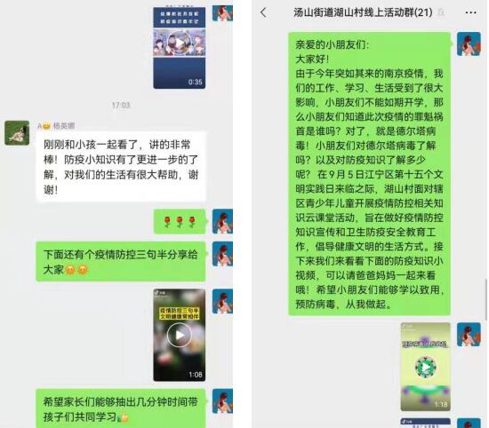 “有這樣的講座課程,可以代替集中教育,真的很好。”“聽了這個(gè)云課堂,對于疫情防控知識有了更加深入的了解,點(diǎn)贊!”......在湖山村線上活動群中,青少年兒童在家長的陪伴下一同觀看了疫情防控科普視頻,聆聽了工作人員分享的疫情防控三句半,線上學(xué)習(xí)氛圍十分濃厚。