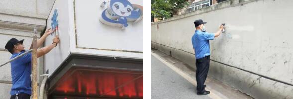 在處理各類(lèi)“牛皮癬”時(shí),隊(duì)員就門(mén)頭違規(guī)粘膠廣告,利用梯子爬上高墻進(jìn)行鏟除;對(duì)于亂涂畫(huà)廣告,則選用顏色貼近本色的自噴漆進(jìn)行噴涂覆蓋,多措并舉消除“牛皮癬”頑疾。
