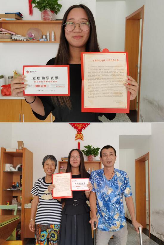 近日,南京銀行股份有限公司將“圓夢(mèng)行動(dòng)”帶到了南京市江寧區(qū)淳化街道青龍社區(qū),在這里,他們資助了一位殘疾家庭的困難學(xué)子——程雨,為她的大學(xué)旅程保駕護(hù)航。