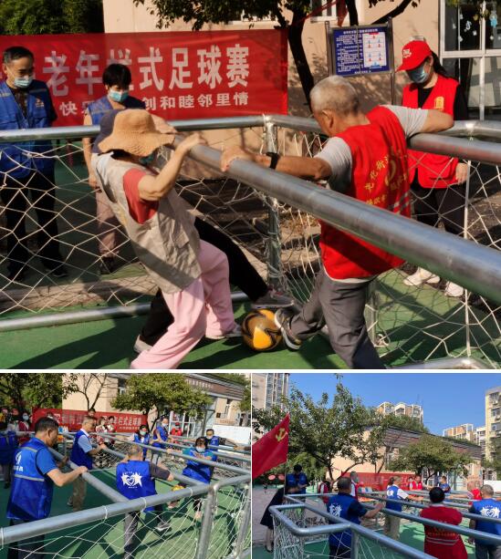 9月6日,讓居民們期待已久的欄式足球終于露出了廬山真面目。欄式足球以其適合老年人的“安全、健身、趣味、和睦鄰里”的特點(diǎn),在許多老年人之中備受歡迎。整個“足球場”占地不過十幾平方米,由幾根欄桿和球門組成。沙書記率先拿著足球,為大家講解游戲規(guī)則,并邀請10名居民參與游戲演示,在場的老人們踴躍報名,居民們也紛紛下場親身感受游戲的樂趣。“5個人一組,一個守門員。叔叔阿姨站好位置,扶好欄桿,注意安全。我們的目標(biāo)是把球踢進(jìn)對方的球門里……”在沙書記講解完后,游戲正式開始。叔叔阿姨們很快掌握了游戲規(guī)則,各個精神矍鑠,很快就拿下比賽的第一分??吹嚼先藗儗@個項(xiàng)目興趣盎然,沙書記提議往后可以經(jīng)常開展小區(qū)居民之間的比賽,通過游戲促進(jìn)中老年人的身體健康,大大提高居民凝聚力,得到了老人和居民的支持。
